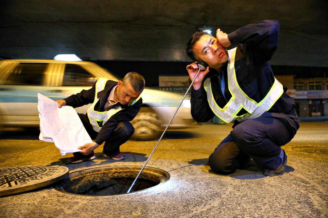 管網(wǎng)檢漏,是降低產(chǎn)銷差的有效措施。圖為檢漏員在疑似漏點(diǎn)周圍的每一處井蓋仔細(xì)探聽