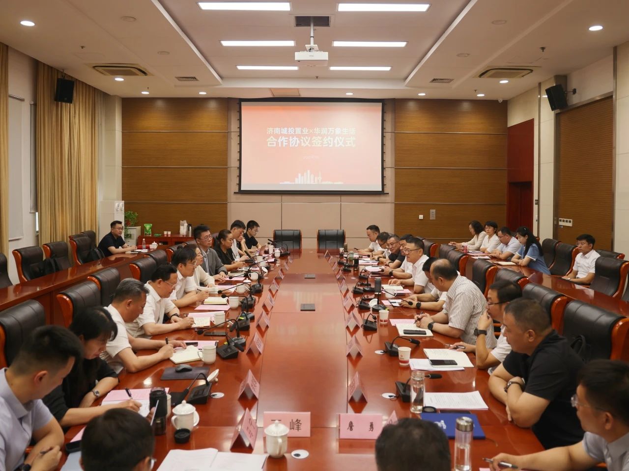 與會人員共同見證了濟(jì)南城投置業(yè)與華潤萬象生活簽署合作協(xié)議,重點(diǎn)圍繞如何更好地服務(wù)項目落地、強(qiáng)化要素保障等進(jìn)行了座談交流。