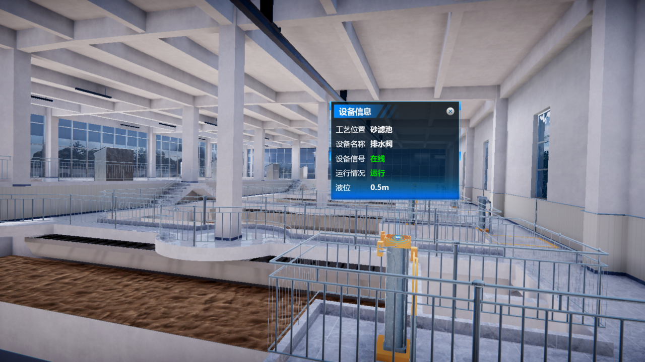 在起步區(qū)水廠數(shù)字化中心,三維數(shù)字化全景把“實體空間”和“虛擬呈現(xiàn)”完美地融合在了一起。通過傳感器采集“實體空間”生產(chǎn)制造過程中的所有實時數(shù)據(jù),能直觀掌握相關(guān)設(shè)備儀器的工作狀態(tài),以三維可視化的形式同步觀察、檢測工藝流程上每臺被檢設(shè)備所處的狀態(tài)。系統(tǒng)還可以任意選取虛擬場景中的相關(guān)物品,對其屬性、狀態(tài)、行為等參數(shù)進行查看,促進廠區(qū)高效運行。